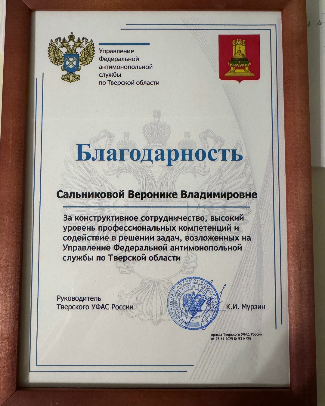 Поздравляем, уважаемая Вероника Владимировна! Гордимся Вами! Благодарим за ответственное и эффективное взаимодействие с УФАС по Тверской области.